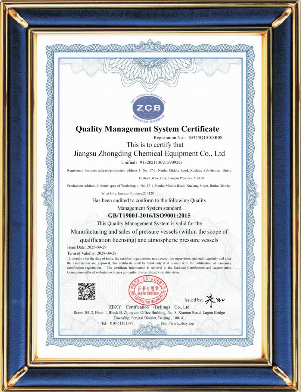 ISO9001質量體系認證證書