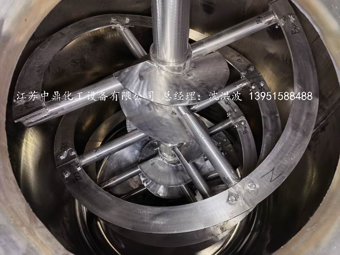 此釜螺帶為:大圈螺帶上翻+小圈螺帶下壓=組合雙螺帶攪拌器