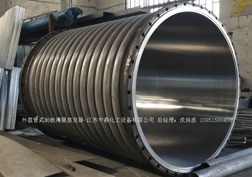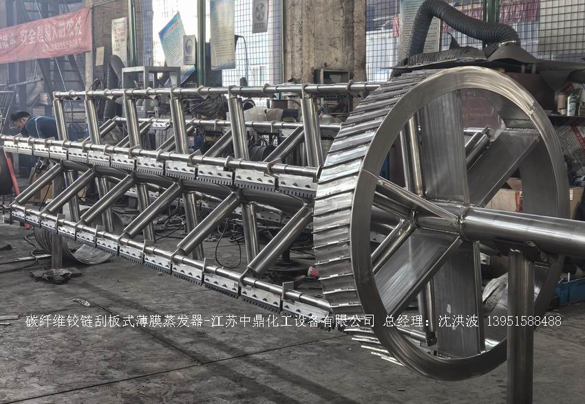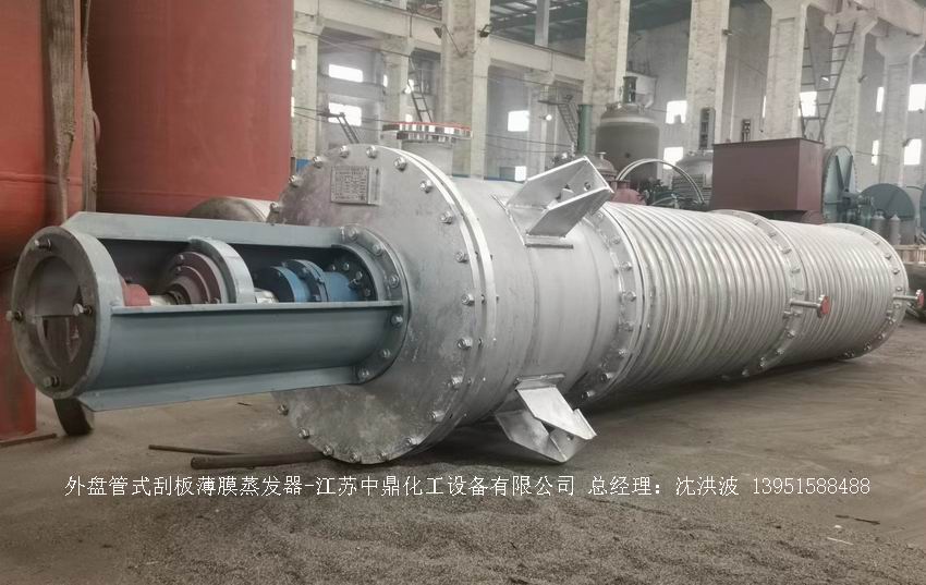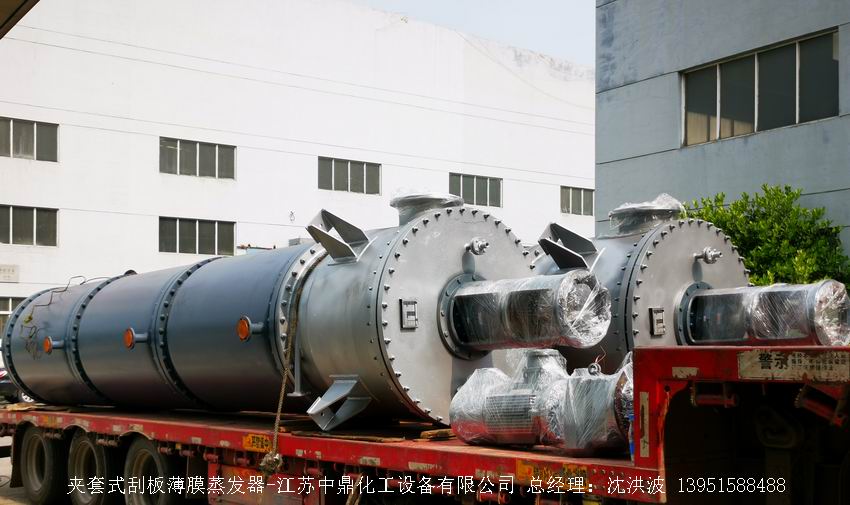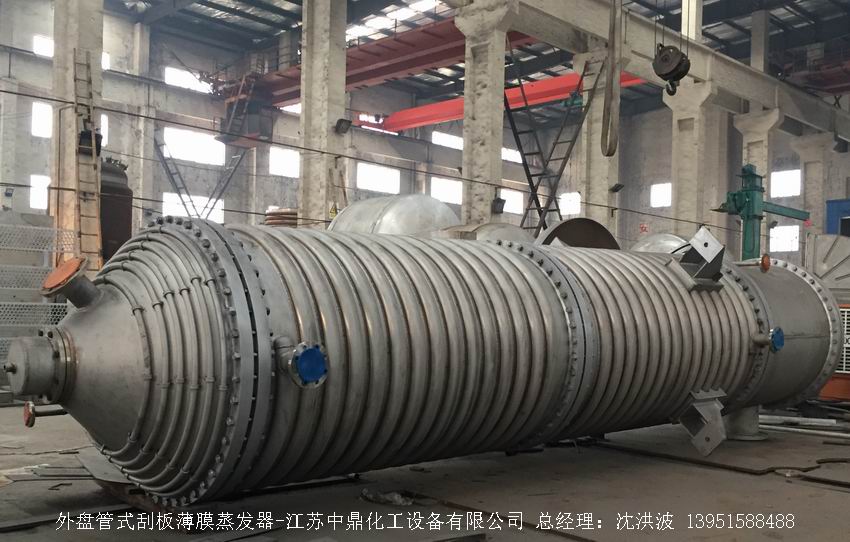 —————————————————————————————————————————————————————————————————————————        江蘇中鼎化工設備有限公司--離心式刮板薄膜蒸發器主要由加熱外盤半管式夾套(半管夾套內走蒸汽,導熱油,熔鹽或者熱水等循環給蒸發器外壁加溫,通過熱傳導,把蒸發器內壁形成的物料薄膜中的水份蒸發減少,提高物料的濃度百分比。一般設計壓力為0.3mpa~2.5mpa左右,如果是蒸汽溫度一般在180°以下,導熱油溫度一般在280°以下,熔鹽溫度一般在380°以下。刮板也稱刮刀(刮板分為:玻纖四氟刮板、碳纖維四氟刮板、石墨四氟刮板、黃銅刮板、合金鋼等)和傳動裝置:電機(普通變頻電機、防爆變頻電機、高速變頻電機),減速機(擺線針輪減速機、齒輪減速機),機架軸封系統(單端面機械密封、雙端面機械密封、磁力密封等,如果抽真空必須選用雙端面機械密封或者磁力密封),轉動軸汽液分離裝置液體分布器蒸發器轉子支架軌道刮板槽底部軸套等部件組成。外盤半管內或者夾套內通加熱的熱源,刮板裝在可旋轉的軸上,刮板和加熱夾套內壁保持很小間隙,通常為0.5~1.5 mm。在旋轉時通過離心力,使刮板與內壁緊密接觸。把物料從壁上刮下。料液經預熱后由蒸發器上部進料口沿切線方向噴進,通過液體分布器分散盤把液體均勻分布到蒸發器筒體表面,在重力和旋轉刮板的作用下,均勻分布在蒸發器內壁形成下旋薄膜,并在下降過程中不斷被蒸發濃縮,完成液由底部排出,二次蒸汽向上從頂部倉逸出(一般通過真空泵抽出)二次蒸汽再通過汽液分離器、冷凝器處理。在某些場合下,這種蒸發器可將溶液蒸干,在底部直接得到固體產品。這類蒸發器的缺點是結構復雜制造\安裝和維修工作量大。