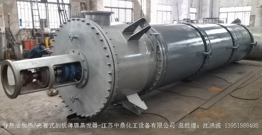 江蘇中鼎化工設備有限公司--離心式刮板薄膜蒸發器主要由加熱外盤半管式夾套(半管夾套內走蒸汽,導熱油,熔鹽或者熱水等循環給蒸發器外壁加溫,通過熱傳導,把蒸發器內壁形成的物料薄膜中的水份蒸發減少,提高物料的濃度百分比。一般設計壓力為0.3mpa~2.5mpa左右,